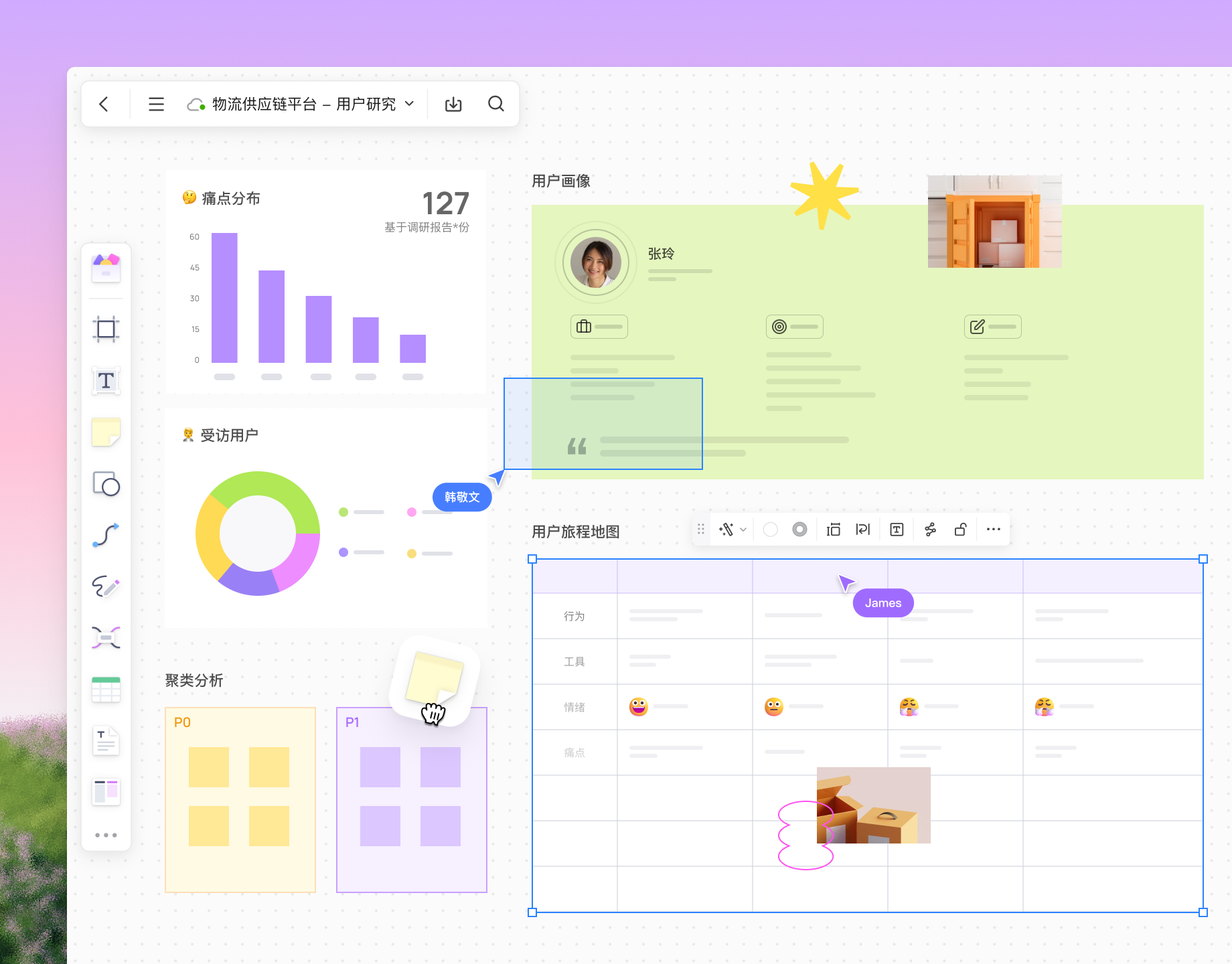 梳理用户访谈、调研结果,提炼痛点与机会点,进行可视化分析+团队同步协作